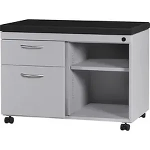 Molly Workhorse Cabinet satisfies your functional needs with a large capacity. It is the perfect companion for small and medium-size printers. Molly offers a spacious top deck, mobility and plenty of storage for personal items, supplies and filing. It includes one box drawer and one file drawer on the left and two open shelves on the right. One shelf is adjustable. Both drawers are secured with a core-removable lock and feature a loop-pull front in satin nickel. Cushion top upholstered in black fabric provides temporary seating. Cabinet height listed includes black plastic 37mm casters (two locking and two nonlocking). Weight capacity is 200 lb.