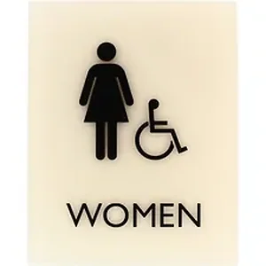 Accessible restroom sign for women features a tamper-resistant, protective lens to keep your sign looking like new for lasting readability. Female pictogram, accessible pictogram and capital letters that display the word women are colored black and positioned on top of a beige background for a professional look. ADA-compliant sign also includes braille that is directly below the text to ensure everyone can read the message. Included foam tape secures instantly to surfaces for quick display in a visible location.