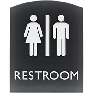 Restroom sign for all genders features a tamper-resistant, protective lens to keep your sign looking like new for lasting readability. Female pictogram, male pictogram and capital letters that display the word restroom are colored white and positioned on top of a dark gray background for a professional look. ADA-compliant sign also includes braille that is directly below the text to ensure everyone can read the message. Included foam tape secures instantly to surfaces for quick display in a visible location.