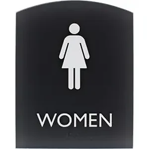 Restroom sign for women features a tamper-resistant, protective lens to keep your sign looking like new for lasting readability. Female pictogram and capital letters that display the word women are colored white and positioned on top of a dark gray background for a professional look. ADA-compliant sign also includes braille that is directly below the text to ensure everyone can read the message. Included foam tape secures instantly to surfaces for quick display in a visible location.