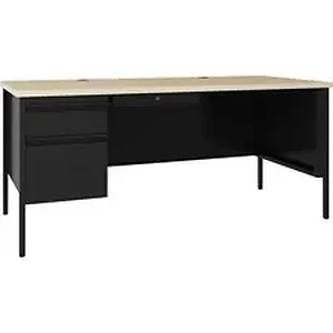 Single-pedestal desk belongs to the Lorell Fortress Series Teachers Desks that offer a practical and professional desk solution ideal for educational offices and classrooms. Durable, high-quality steel construction in black withstands rigorous daily use. Top features a T-mold edge to promote safety and high-performance, Maple laminate surface that is scratch-resistant, stain-resistant and water-resistant. Desk is also equipped a 3/4 modesty panel, locking center drawer and box/file pedestal on the left with full-extension, ball-bearing slides. Integrated drawer pulls are full-width. Central lock system locks all drawers. Reinforced, double-frame inner structure keeps desk solid and sturdy for years of use. Steel construction and laminate top make the desk easy to clean and disinfect. Desk meets or exceeds ANSI/BIFMA standards.