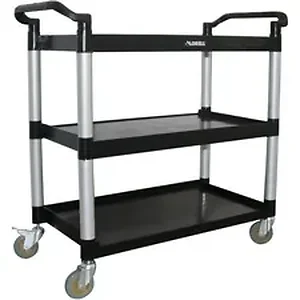 Utility cart offers a convenient worksurface and spacious storage for your supplies. Smooth plastic shelves are easy to clean. The three shelves are each surrounded with a raised lip to keep your contents secure during transit. Open style allows easy access. Quiet casters help eliminate noise during use. Dual user-friendly handles and 4" wheels (two directional wheels, two universal wheels) allow you to maneuver with ease so you can transport your items from room to room. Durable plastic construction supports up to 300 lb. with a 100 lb. capacity per shelf.