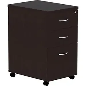 Freestanding, mobile pedestal is part of Lorell Essentials Series Laminate Furniture with high-quality laminate construction and a contemporary design. Pedestal offers a box/box/file design. The file drawer includes hangrails and holds letter-size and legal-size hanging files. Espresso laminate top is 1" thick for durability. Pedestal rolls easily on four 1-1/2" dual-wheel casters. Design also includes 96mm metal drawer pulls with a silver brush finish and 3mm PVC edges.