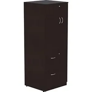 Tall storage cabinet can be used with Lorell Essentials or Relevance Series with high-quality laminate construction and metal-to-metal, cam-lock connections. Design of the cabinet expands your storage opportunities with the varied sizes of compartments. Full-length compartment on the right features a door to conceal contents. On the left, the half-length compartment includes a locking door and two shelves. Bottom two drawers lock to secure your belongings and hold letter-size files. Durable, Espresso laminate surfaces provide a professional look and are abrasion-resistant. Back is finished on both sides. Cabinet is made of particleboard and medium-density fiberboard. Adjustable levelers help stabilize the cabinet on uneven surfaces.