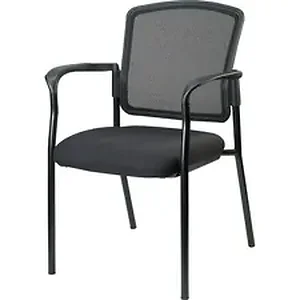 Inviting guest chair features a breathable mesh back and a cushioned seat upholstered in black fabric for comfortable seating in your waiting room or office. Chair is stackable up to four high for convenient, short-term or long-term storage. Black steel frame is powder-coated for durability. Weight capacity is 250 lb. Back measures 18-1/2" wide x 2" thick x 13-1/2" high. Chair is Greenguard complaint.