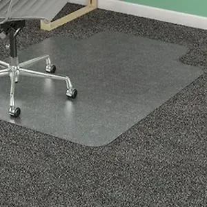 Clear rectangular chairmat will extend the life of your carpet by spreading out the pressure from your chair casters. It will also reduce fatigue by allowing easier rolling across your work space with less back and leg strain. Use on medium-plush carpets including padding. Studded back is designed to achieve a strong grip without piercing or damaging your carpet backing, smooth edge for smoother rolling on and off your mat, and a 25" wide x 12" deep lip to cover the carpet under your desk when your chair is pushed all the way in. Crystal-clear chairmat lets the beauty of your carpeting show through. Heavy-duty material stands up to daily wear and tear.