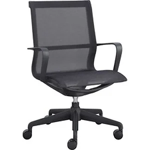 Executive Mesh Mid-back Chair provides flexible support during stressful workdays. Black nylon mesh over the back and seat offer a breathable surface that responds to the shape of your body. Ergonomic curve in the low back offers a more natural space for a more natural sitting position. Other comfort features include dual-action synchro tilt, pneumatic seat-height adjustment, 360-degree swivel, tilt and tilt lock. Plastic chair frame and plastic fixed arms in matching black are easy to clean. The five-star nylon base is equipped with dual-wheel casters for easy mobility. Weight capacity is 275 lb.