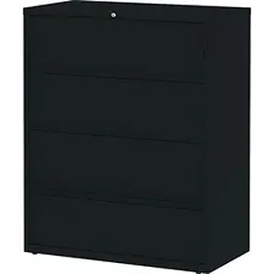 Receding lateral file with roll-out shelves offers a total of four drawers with heavy-duty, three-piece, ball-bearing slide suspension for smooth drawer movement. All drawers above the bottom one have receding fronts and roll-out shelves for easy access to your files. Bottom drawer has a fixed front. Included hangrails accommodate side-to-side filing of letter, legal or A4-size folders. Dual lock bars secure both ends of drawers. Interlock system prohibits the extension of more than one drawer at a time. 42" wide lateral file also features a core-removable lock; full-width designer drawer pulls; four adjustable leveling guides for stabilization and reinforced double-base construction. Lateral file does not include dividers. File meets/exceeds applicable ANSI/BIFMA standards.
