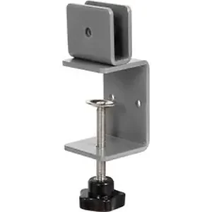 Sturdy brackets secure acrylic panels in place on tables to help protect employees, visitors and customers from respiratory droplets. It is made of steel with a silver powder coating for durability. The bottom part clamps onto tabletops/worksurfaces up to 2" thick. Top part clamps panels up to 3/8" thick. Set of two brackets comes with a knob and screws for mounting.