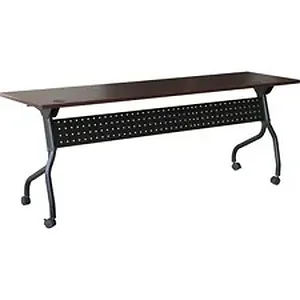 Part of the Lorell Preference Series, this versatile training table offers flexible configurations and convenient storage. Use individually or secure together into rows with a reliable metal connector (sold separately). Mahogany top flips up for easy storage without having to remove the connector. Top features a melamine surface with a 3mm PVC straight edge. Two grommets allow easy cord management. Four-leg, all-metal black base features a one-way fold and modesty panel. Table rolls easily on four nylon casters with brakes.
