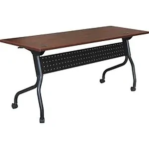 Part of the Lorell Preference Series, this versatile training table offers flexible configurations and convenient storage. Use individually or secure together into rows with a reliable metal connector (sold separately). Cherry top flips up for easy storage without having to remove the connector. Top features a melamine surface with a 3mm PVC straight edge. Two grommets allow easy cord management. Four-leg, all-metal black base features a one-way fold and modesty panel. Table rolls easily on four nylon casters with brakes.