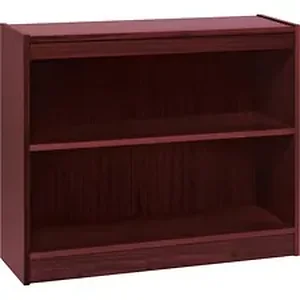 High-quality, veneer bookcase features a vintage square design. The bottom shelf is fixed. The other solid, 3/4" thick shelf is adjustable on 1-3/4" centers with pinhole attachments. Two-shelf bookcase has a laminate finish on the back's interior and an unfinished back side. Each shelf holds up to 110 lb.