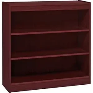 High-quality, veneer bookcase features a vintage square design. Solid, 3/4" thick shelves are adjustable on 1-3/4" centers with pinhole attachments, except for bottom shelf. Three-shelf bookcase has a laminate finish on the back's interior and an unfinished back side. Each shelf holds up to 110 lb.