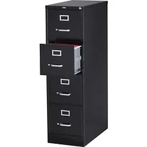 Commercial-grade vertical file features four high-sided drawers that accommodate letter-size, hanging file folders without additional accessories. Slide suspension allows maximum drawer extension. Steel ball bearings provide smooth, quiet drawer performance. Even fully loaded, these drawers open with ease. Adjustable wire followers keep files upright. 26-1/2" deep vertical file also features a core-removable lock for security, aluminum label holders for easy referencing, convenient pull handles and heavy-gauge steel construction with recycled content. Vertical file meets or exceeds ANSI/BIFMA industry standards.