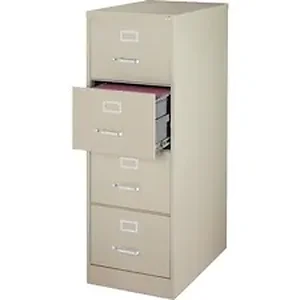 Commercial-grade vertical file features four high-sided drawers that accommodate legal-size, hanging file folders without additional accessories. Slide suspension allows maximum drawer extension. Steel ball bearings provide smooth, quiet drawer performance. Even fully loaded, these drawers open with ease. Adjustable wire followers keep files upright. 26-1/2" deep vertical file also features a core-removable lock for security, aluminum label holders for easy referencing, convenient pull handles and heavy-gauge steel construction with recycled content. Vertical file meets or exceeds ANSI/BIFMA industry standards.