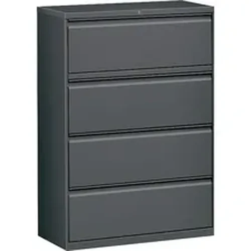 42" wide lateral file features four versatile drawers with hanging file rails for side-to-side filing of letter-size, legal-size or A4-size folders. Each drawer has a magnetic label holder for easy identification where you need it. Design also features a core-removable lock for security, dual locking bars, full-width pull, ball-bearing slide suspension for smooth opening and closing, reinforced base, and four adjustable leveling guides for stabilization. Interlock system prohibits the extension of more than one drawer at a time for your safety. Counterweight prevents tipping. Lateral file meets or exceeds applicable ANSI/BIFMA standards.