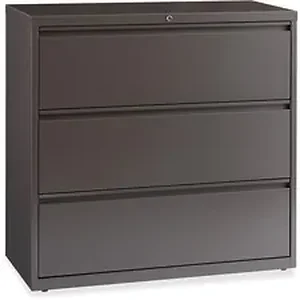 42" wide lateral file features three versatile drawers with hanging file rails for side-to-side filing of letter-size, legal-size or A4-size. Each drawer has a magnetic label holder for easy identification where you need it. Design also features a core-removable lock for security; dual locking bars; full-width pull; ball-bearing slide suspension for smooth opening and closing; reinforced base; and four adjustable leveling guides for stabilization. Interlock system prohibits the extension of more than one drawer at a time for your safety. Counterweight prevents tipping. Lateral file meets or exceeds applicable ANSI/BIFMA standards.