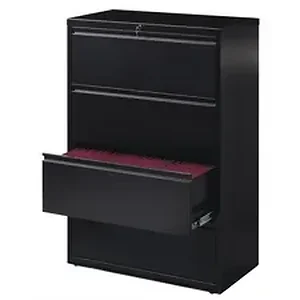 36" wide lateral file features four versatile drawers with hanging file rails for side-to-side filing in letter-size, legal-size or A4-size. Each drawer has a magnetic label holder for easy identification where you need it. Durable, fully assembled steel construction with nonporous surface is easy to clean and disinfect. Design also features a core-removable lock for security, dual locking bars, full-width pull, ball-bearing slide suspension for smooth opening and closing, reinforced base, and four adjustable leveling guides for stabilization. Interlock system prohibits the extension of more than one drawer at a time for your safety. Counterweight prevents tipping. Lateral file meets or exceeds applicable ANSI/BIFMA standards.