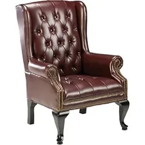 Lorell LLR 60605 777 QA Queen Anne Wing-Back Reception Chair - Burgundy Vinyl Seat - Mahogany Hardwood Frame - Four-legg
