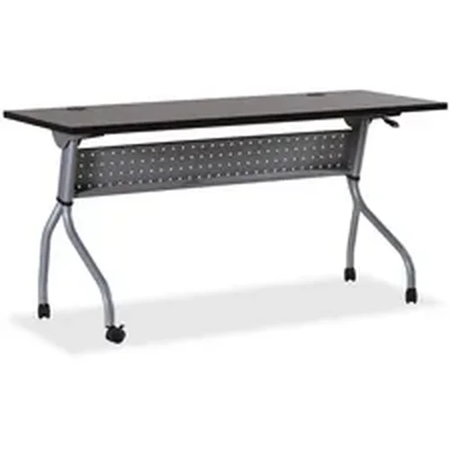Part of the Lorell Preference Series, this versatile training table offers flexible configurations and convenient storage. Use individually or secure together into rows with a reliable metal connector (sold separately). Espresso top flips up for easy storage without having to remove the connector. Top features a melamine surface with a 3mm PVC straight edge. Two grommets allow easy cord management. Four-leg, all-metal silver base features a one-way fold and modesty panel. Table rolls easily on four nylon casters with brakes.