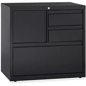 Lateral file offers versatile storage options with a personal storage compartment, two box drawers and a file drawer. File drawer includes hanging file rails for side-to-side filing in letter-size, legal-size or A4-size. Storage compartment includes a grommet for cable management. All three drawers and compartment lock with a core-removable lock with dual locking bars. Drawers also feature full-width pulls and ball-bearing slide suspension. Use the included magnetic label holders for easy identification of drawer contents. Interlock system prohibits opening more than one drawer at a time. Counterweight prevents tipping. Steel construction has a baked enamel finish for durability. Lateral file also offers a reinforced base and four adjustable leveling glides to stabilize it on uneven surfaces. Lateral file meets or exceeds ANSI-BIFMA standards