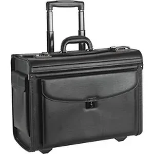 Rolling Laptop Catalog case helps protect your laptop computer from shocks of the road while traveling. Also holds catalogs, binders and files, with outside pockets for files and accessories. Sturdy push-button retractable handle telescopes out to provide easy maneuverability of case's built-in wheels. Neatly retracts back in when not in use. Rolling case is made of durable black vinyl.