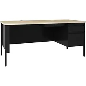 66" wide single-pedestal desk is part of the Lorell Fortress Series, a practical and professional desk solution. Use this right-pedestal desk with a Fortress left return for L-shaped configurations. Both have 3/4-height modesty panels for seamless lines. High-performance steel construction stands up to rigorous daily use. The 1-1/8" thick top with square edges features a Maple laminate surface that is scratch-resistant, stain-resistant and water-resistant. Desk design also features a box/file pedestal on the right. Both drawers lock and offer full-extension, ball-bearing slides and full-width, integrated drawer pulls. File drawer accommodates letter-size files. Central-locking center drawer features a core-removable lock. Two grommets allow easy cord management. Steel construction and laminate top make the desk easy to clean and disinfect. Reinforced, double-frame inner structure keeps desk solid and sturdy for years of use. Steel desk in black meets or exceeds ANSI/BIFMA standards.