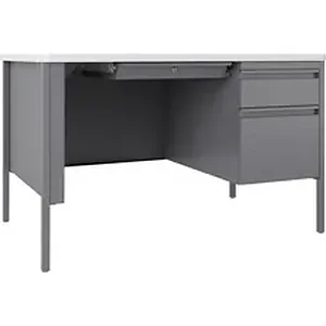Single-pedestal desk belongs to the Lorell Fortress Series Teachers Desks that offer a practical and professional desk solution ideal for educational offices and classrooms. Durable, high-quality, platinum steel construction withstands rigorous daily use. Durable top features a T-mold edge to promote safety and high-performance, white laminate surface that is scratch-resistant, stain-resistant and water-resistant. Desk is also equipped a 3/4 modesty panel, locking center drawer and box/file pedestal on the right with full-extension, ball-bearing slides. Integrated drawer pulls are full-width. Central lock system locks all drawers. Steel construction and laminate top make the desk easy to clean and disinfect. Reinforced, double-frame inner structure keeps desk solid and sturdy for years of use. Steel desking meets or exceeds ANSI/BIFMA standards.