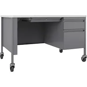 Single-pedestal desk belongs to the Lorell Fortress Series Teachers Desks that offer a practical and professional desk solution ideal for educational offices and classrooms. Durable, high-quality steel construction in platinum withstands rigorous daily use. The durable top features a T-mold edge to promote safety and high-performance, white laminate surface that is scratch-resistant, stain-resistant and water-resistant. Mobile desk is also equipped a 3/4 modesty panel, locking center drawer and box/file pedestal on the right with full-extension, ball-bearing slides. Integrated drawer pulls are full-width. Central lock system locks all drawers. Desk also features two locking casters and two nonlocking casters. Steel construction and laminate top make the desk easy to clean and disinfect. Reinforced, double-frame inner structure keeps desk solid and sturdy for years of use. Steel desking meets or exceeds ANSI/BIFMA standards.