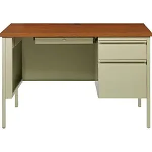 45-1/2" wide single-pedestal desk is part of the Lorell Fortress Series, a practical and professional desk solution ideal for business, government and educational offices. Use this right-pedestal desk with a Fortress left return for L-shaped configurations. Both have 3/4-height modesty panels for seamless lines. Durable, high-performance steel construction stands up to rigorous daily use. The 1-1/8" thick top with square edges features an Oak laminate surface that is scratch-resistant, stain-resistant and water-resistant. Design also features a box/file pedestal on the right. Both drawers lock and offer full-extension, ball-bearing slides and full-width, integrated drawer pulls. File drawer accommodates letter-size files. Central-locking center drawer features a core-removable lock. Center grommet allows easy cord management. Reinforced, double-frame inner structure keeps desk solid and sturdy for years of use. Steel desk meets or exceeds ANSI/BIFMA standards.