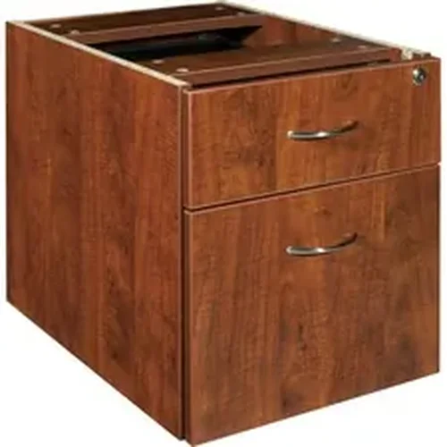 Hanging pedestal is part of Lorell Essentials Series Laminate Furniture with high-quality laminate construction and metal-to-metal, cam-lock connections. Pedestal includes one box drawer and one file drawer that accommodates letter-size and legal-size files with included hangrails. Both drawers offer full extension and roll smoothly on steel ball bearings. Design also includes Cherry laminate for durability, 3mm PVC edges and adjustable feet. Pedestal cannot be used freestanding. Predrilled holes with metal inserts offer easy attachment by screws.