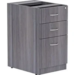 Unfinished pedestal is part of Lorell Essentials Series Laminate Furniture with high-quality, Weathered Charcoal laminate construction. Pedestal offers a box/box/file design to store office supplies and important files. The file drawer includes hangrails and holds letter-size and legal-size hanging files. Design also includes 96mm metal drawer pulls with a silver brush finish and 3mm PVC edges. Pedestal should not be used with a top (sold separately). It attaches to the underside of the top of an Essentials Series desk, credenza or return with the included fasteners and extends to the floor. Adjustable floor guides offer stabilization.