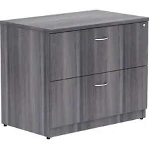 Lateral file is part of Lorell Essentials Series Laminate Furniture with high-quality laminate construction and a contemporary design. Weathered Charcoal laminate top is 1" thick for durability. File drawer accommodates letter-size and legal-size files with included hangrails. Both drawers roll smoothly on steel ball-bearings with full extension. Central locking system locks both drawers at once. Anti-tip feature allows only one drawer to be opened at a time. Design also includes 3mm PVC edges and adjustable levelers for stabilization.