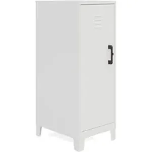 The versatile design of this personal locker makes it suitable for office and home use. Stylish, modern look will fit right in with your offices, classrooms, playrooms, basements and garages. The SOHO Locker adds a cool, industrial touch to your space. Sturdy and durable welded steel construction provides long-lasting strength. Recycled content makes it an eco-friendly choice. Nonporous surface is easy to clean and disinfect. All you need is a damp cloth. Hinged door and a locking mechanism keep your belongings safe. Vented locking door allows airflow while protecting your privacy. Three built-in shelves are perfect for stashing schoolwork, organizing work supplies and putting away sporting equipment, toys and games. Each shelf can support up to 40 lb. to meet all your different needs. Built-in risers keep storage locker off your potentially damp floor. Locker ships fully assembled so you can get organized right away.