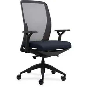 Contemporary swivel task chair features a unique mesh back that provides superior comfort and support with adjustable lumbar support and air circulation. Suspended seat contains bands of rubber embedded in molded foam covered with high-quality, dark blue Crepe fabric. Integrated seat slider lets you set the seat exactly where you want it. Three-paddle control provides one-touch seat-height adjustment, four-position back lock and tilt tension. Six-way arms, adjustable tilt tension and five back-lock positions let you adjust the chair to meet your specific preferences. Arms move up and down; in and out; and forward and back for enhanced ergonomic support. Synchronized tilt control provides reduced front edge rise while reclining. When desired, a convenient back lock prevents the back from reclining. Soft-touch armrest pads provide comfort and protection for desks or tables. Fiberglass-infused, reinforced nylon base with high-performance casters delivers strength, support and comfort.