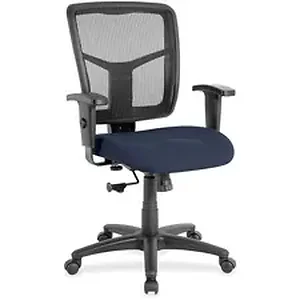 Managerial mid-back chair features a breathable mesh back chair and fabric-upholstered seat. Mesh upholstery is made of high-strength elastic nylon. Ergonomically designed mid-back matches the natural curvature of a person's back. Arms adjust in height (25" to 28-7/10") and in width (24" to 26"). Functions include pneumatic seat-height adjustment (17-7/10" to 21" high from the floor), 360-degree swivel and swivel tilt mechanism. Black frame has five-star, reinforced nylon base (25" diameter) with casters for easy mobility. Seat size is 20" wide x 18-7/10" depth. Back measures 20" wide (at the widest portion) x 19-7/10" high. Weight capacity is 250 lb. Chair meets the CA117 fire-retardant standard.