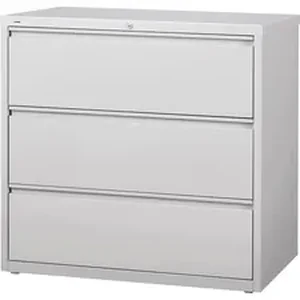 42" wide lateral file features three versatile drawers with hanging file rails for side-to-side filing in letter-size, legal-size or A4-size. Each drawer has a magnetic label holder for easy identification where you need it. Design also features a core-removable lock for security, dual locking bars, full-width pull, ball-bearing slide suspension for smooth opening and closing, reinforced base, and four adjustable leveling guides for stabilization. Interlock system prohibits the extension of more than one drawer at a time for your safety. Counterweight prevents tipping. Lateral file meets or exceeds applicable ANSI/BIFMA standards.