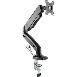 Single-monitor arm in two sections offers versatile positioning and useful features. Adjustable swivel and tilt maximize viewing flexibility. Arm swivels 360 degrees from side to side while the monitor mounting plate swivels 180 degrees. Face of the mounting plate rotates 360 degrees and is 75mm x 75mm and 100mm x 100mm VESA-compatible. You can also tilt your monitor from negative 45 degrees to positive 90 degrees for multiple monitor viewing angles. Monitor arm is height-adjustable to easily improve eye level and posture for optimal comfort. Built-in spring gauge can be adjusted to suit various monitor weights. The 2.0 USB port and audio port in the bottom of the arm are convenient for supporting data transfer, charging and sound input/output. Pear-shaped VESA slot makes monitor installation much easier with a one-step slide-in. Mount through your desk grommet so no need to crawl under your desk to install. Built-in cable management allows an organized and neat work space.