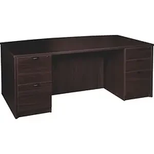 Double-pedestal bowfront desk is part of the elegant, Lorell Prominence 2.0 Series that is perfect for your executive office suites. Durable, Espresso laminate surface is mar-resistant, burn-resistant and impact-resistant to withstand daily work life. The 1" thick top features matching 3mm edgebanding and is manufactured with 45 lb. density particleboard. All surfaces are finished on both sides with high-performance, thermally fused melamine. This 72" wide desk features a full modesty panel for privacy and two 3/4 pedestals with locking drawers to secure files and supplies. One pedestal includes two file drawers while the other pedestal includes two box drawers for supplies and one file drawer for additional file space. File drawers hold letter-size or legal-size hanging files. Box and file drawers have 100 lb. full-suspension, ball-bearing slides. The 3/4" adjustable glides allow desk to remain level on uneven surfaces. Desk ships fully assembled so it's ready for immediate use.