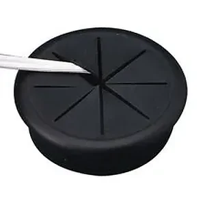 Flexible grommet holds and manages multiple-sized wires and cords. Flexible opening of the single-piece grommet accommodates cords from different directions and keeps them hidden and away from the desktop. Grommet has a 2-3/8" diameter (60mm).