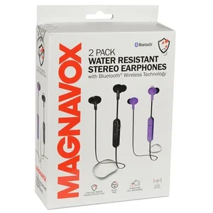 <ul><li><strong>Magnavox MBH525C Bluetooth Stereo Earphones<br></li><li><strong>General Features:<li>Pack of two (2)</li><li>Colors: Black and Purple</li><li>Wireless Bluetooth 4.1</li><li>Water and dust resistant</li><li>Protection rating: IP44</li><li>Built-in microphone and volume control</li><li>Micro USB charge port</li><li>80 mAh rechargeable Lithium-ion battery<br><li><strong>Specifications:<li>Signal to noise radio: 80 db</li><li>Drivers: 10 mm</li><li>Frequency response: 65hz - 20kHz</li><li>Cord length: 30""