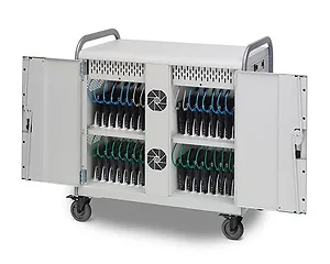 The Bretford Link L Cart is designed for easy transportation and secure storage of up to 32 notebooks. This cart features a lockable design, providing peace of mind for educational and professional environments. Its concrete finish gives it a modern look while ensuring durability.