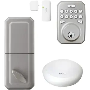 • Detects opening and closing of the door ;• Open space between lock and HUB up to 328 ft.;• Operating temperature: 23deg F to 113deg F ;• Body weight: 1.06 oz.;• Door sensor weight: 1.06 oz.;• Compatible with Alexa(R) and Google(R) ;• Smartphone app entry ;• Option to send temporary key codes to friends and visitors ;• Notifies when dead bolt is locked/unlocked or open/closed;• Autolocks switch on when door is closed ;• Compatible door thickness: 1.25 in. to 1.725 in. ;• Latch backset: 2.45 in. to 2.75 in. ;• Back module: 6-5/8 in. H x 2-9/16 in. W x 1 in. D;• Depth with thumb turn: 1.625 in.;• Front module: 4.5 in. H x 3 in. W x .5 in. D;• Depth with key cylinder: 1 in.;• Kit includes: ;• Gen 2 door lock (front is keypad, back has deadbolt locking knob) ;• Door/window sensor ;• Smart HUB ;• Power cable ;• Hardware;• Brushed Nickel finish;