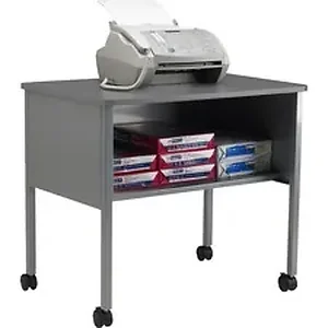Ideal for word processing equipment, this machine stand offers a compact worksurface on the thermafoil top. Shelf below the worksurface offers ample space to store supplies and measures 29" wide x 14" deep. 11-1/2" opening allows easy access. Steel construction includes square tubing legs. Mobile stand rolls easily on dual-wheel casters. Two casters lock for stability. Weight capacity is 200 lb.