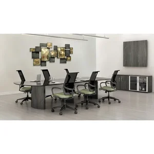 Conference tabletop is part of the Mayline Medina Series with contemporary style and elegant functionality. Clean lines, curved shapes and floating worksurfaces reflect Italian design influences. Gray Steel laminate finish ensures a beautiful collaboration with other Mayline furniture and complements most any decor. Laminate is stain-resistant, water-resistant and abrasion-resistant. Design offers plenty of opportunity for interaction and engagement and can be equipped with power and data outlets to further enhance connection. Grommet hole cutout size is 4" x 8". Durable, 1" thick tabletop has a modesty panel, beveled PVC edge and silver detailing. Weight capacity of the assembled table is 250 lb. Base components are sold separately. Use two Medina curved end bases and a center leg to support this top. Order two tabletops to create a 12' wide top.