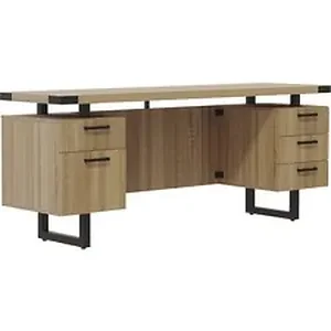 This freestanding credenza provides more storage and extra work space for the Mirella desking unit or as a stand-alone unit. Mirella Casegoods let you revel in the best of both worlds with a contemporary design that provides a residential look for the office. Credenza coordinates with Mirella Conference and Reception units for a cohesive, professional look. The 1-5/8" thick top appears to float because it sits on top of black, discreet brackets on the double-pedestal base. Credenza is made of particleboard covered in smooth, Sand Dune laminate and features black, powder-coated accents. It includes three storage drawers on one pedestal and one storage drawer and one file drawer for letter-size/legal-size files on the other pedestal. Each drawer is accentuated with black drawer pulls made of steel. Pedestals lock to secure your supplies and files and come keyed alike. Credenza is equipped with adjustable leveling glides for stability.