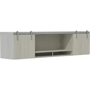 This Mirella Wall-mounted Hutch with sliding wood doors expands your storage options for your Mirella office suite. Mirella Casegoods let you revel in the best of both worlds with a contemporary design that provides a residential look for the office. Hutch coordinates with Mirella Conference and Reception units for a cohesive, professional look. It features brushed silver accents, one compartment and one decorative shelf, dividing the center space between the two cabinet doors on the sides. Wood doors feature sliding, barn door hardware for easy access. Hutch comes with wall-mounting hardware to hang on most walls and save floor space. It is made of particleboard and covered in smooth, White Ash laminate.