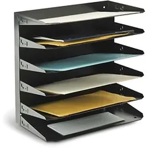 Horizontal organizer keeps important papers at your fingertips with multiple, horizontal file trays. Each tray features an ID label holder to customize trays and identify documents without taking them out of the organizer. Organizer easily holds many combinations of files, forms, magazines, reports, catalogs, sales orders, folders, pads of paper, proposals and mail. Predrilled holes allow easy wall mounting or attachment to partition hangers to save desktop space. Organizer is made of durable, heavy-gauge steel with a scratch-resistant, chip-resistant finish and rolled edges. Nonslip, nonmar padded bottom provides a scratch-free, secure grip.