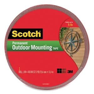 <div><b>General Information</b><hr/><span>Manufacturer</span>:3M<br/><span>Manufacturer Part Number</span>:4011LONG<br/><span>Manufacturer Website Address</span>:http://www.3m.com<br/><span>Brand Name</span>:Scotch<br/><span>Product Line</span>:Permanent Mounting<br/><span>Product Name</span>:Exterior Weather-Resistant Double-Sided Tape with Red Liner<br/><span>Marketing Information</span>:<p>Scotch Outdoor Mounting Tape is great for hanging house numbers, outdoor signs and decor. Weather-resistant, industrial-quality mounting tape can be used on textured surfaces such as painted cement or brick that is clean. Tape holds up to 5 lb.</p> <p><br/><span>Packaged Quantity</span>:1 / Roll<br/><span>Product Type</span>:Mounting Tape<br/></div><div><b>Product Information</b><hr/><span>Tape Width</span>:1"<br/><span>Tape Length</span>:12.50 yd<br/><span>Core Diameter</span>:1"<br/><span>Dispenser Included</span>:No<br/><span>Application/Usage</span>:<ul><li>Mounting</li><li>Attaching</li><li>Holding</li></ul><br/><span>Features</span>:Permanent Mounting<br/></div><div><b>Physical Characteristics</b><hr/><span>Color</span>:Gray<br/></div><div><b>Miscellaneous</b><hr/><span>Recycled</span>:No<br/><span>Assembly Required</span>:No<br/><span>Country of Origin</span>:United States<br/></div>
