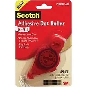 Refill is designed for 3M Scotch Adhesive Dot Rollers that offer precise application - straight or curved. This photo-safe, double-sided tape is neater than glue and initially repositionable. Ideal for home, office, and school projects. The dot adhesive applies precisely and smoothly, even at the end of the roll. Refilling is fast and easy, and requires no threading.